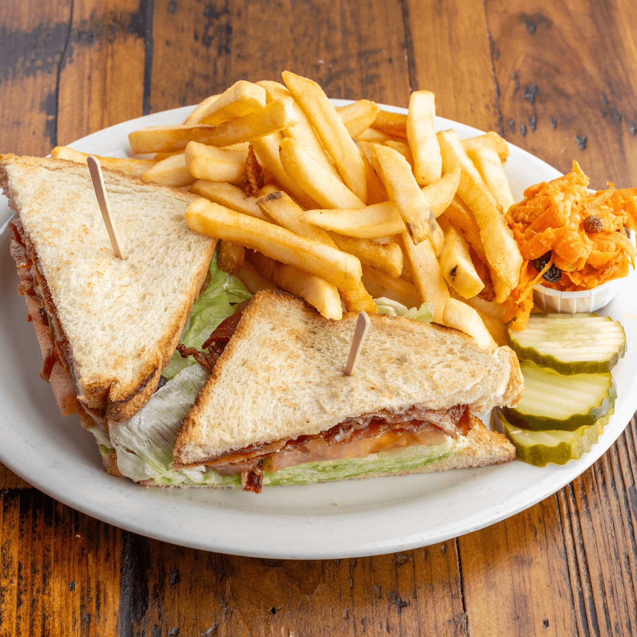Bacon, ham, turkey, lettuce and tomato stacked high on 3 slices of toasted white bread
