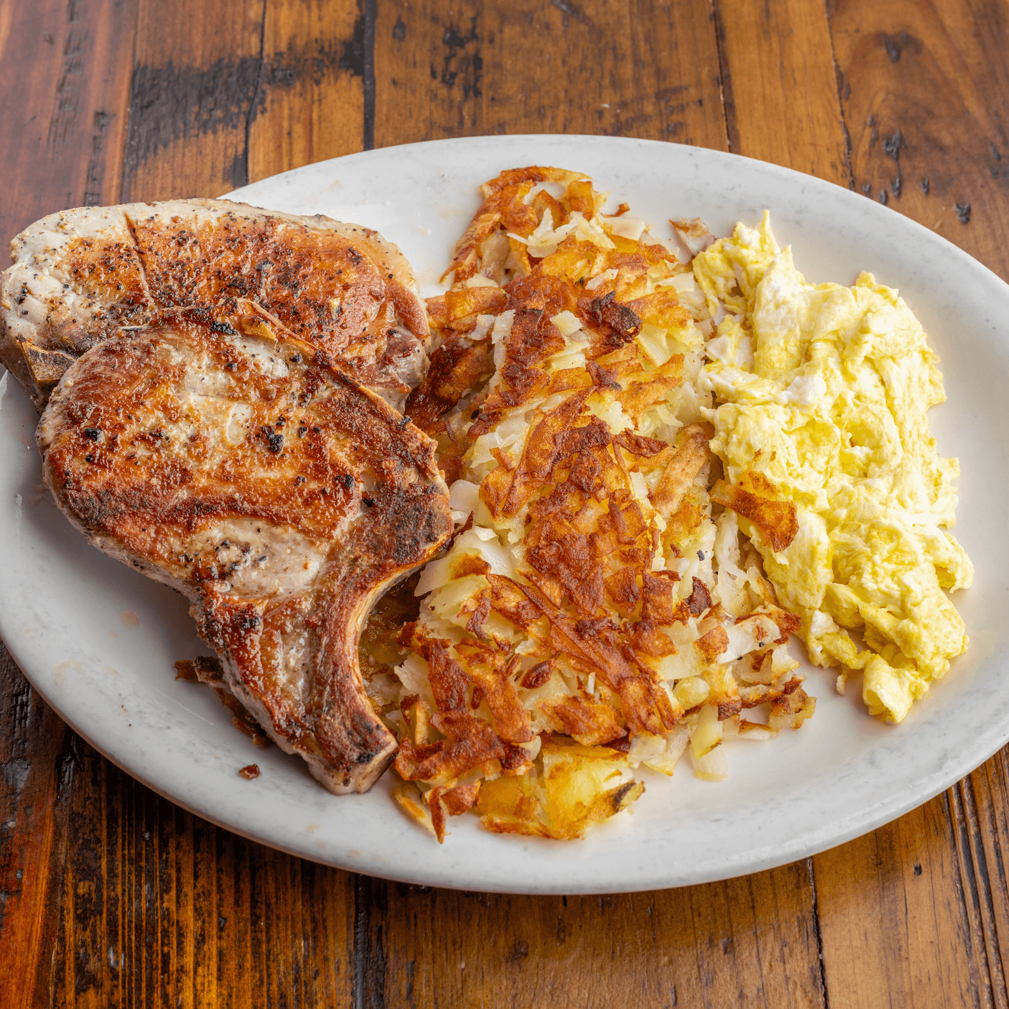 Two eight oz tender and juicy pork chops. Served with a side of applesauce
