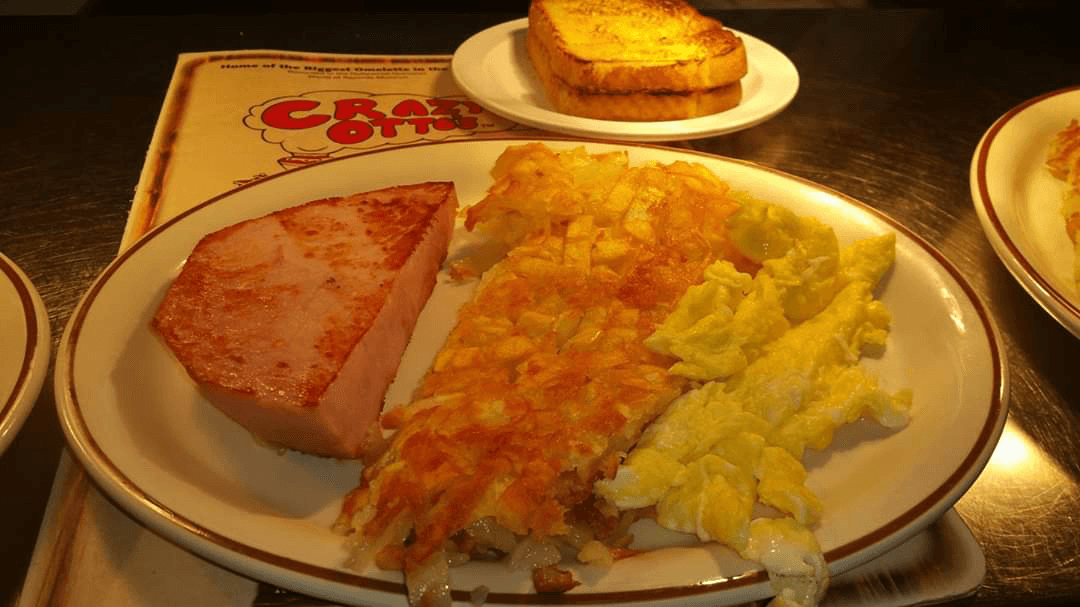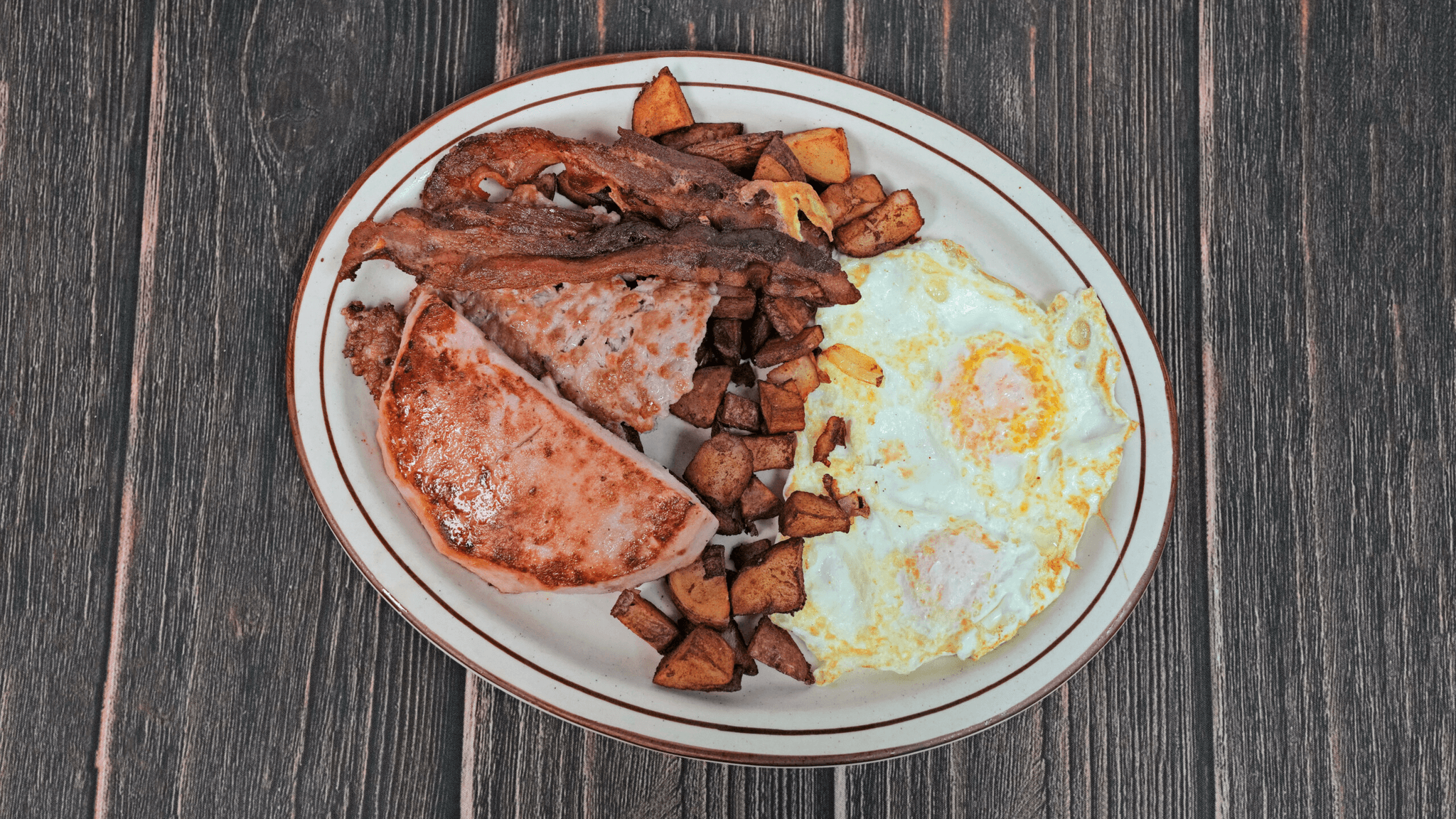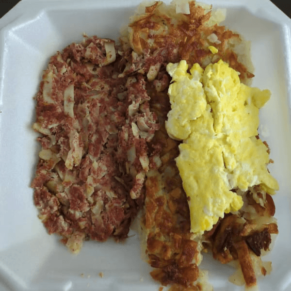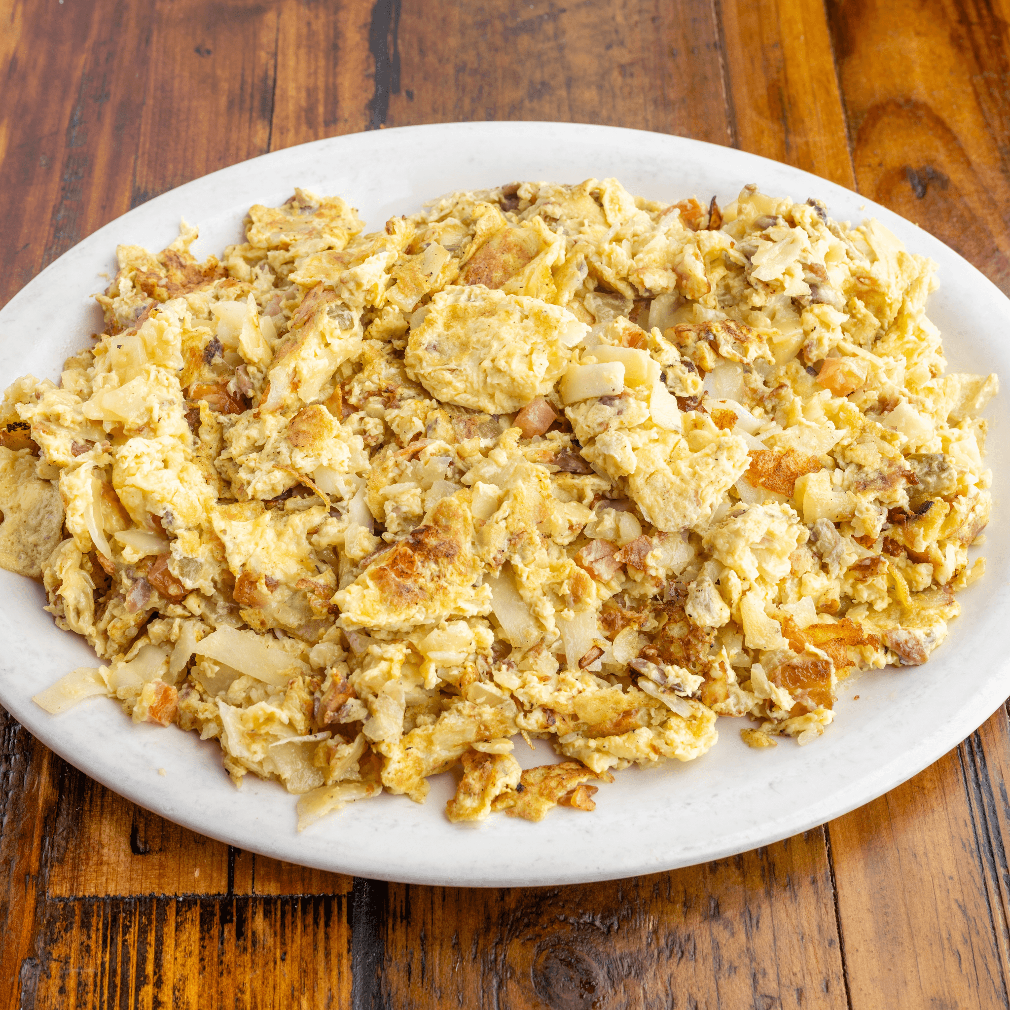 Scrambled eggs, hash browns, onions, bell peppers, tomatoes and mushrooms, all cooked together. Add bacon, sausage or ham for an additional charge