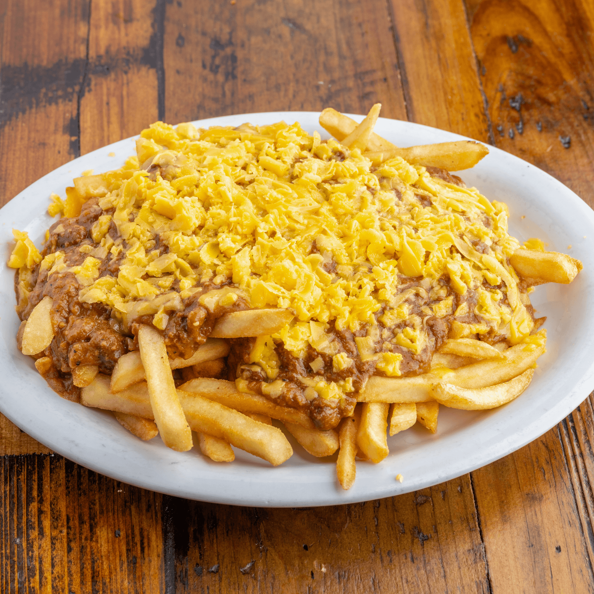 Diced bell pepper and onion, your choice of cheese and topped with home style chili