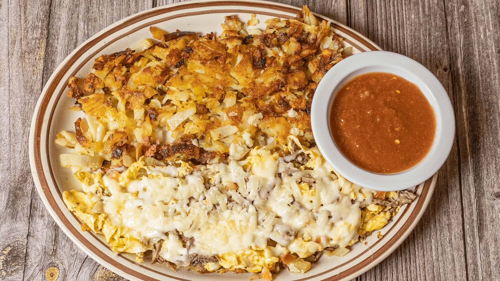 Eggs scrambled together with shredded beef, tomatoes, onions, and bell peppers, topped with your choice of cheese