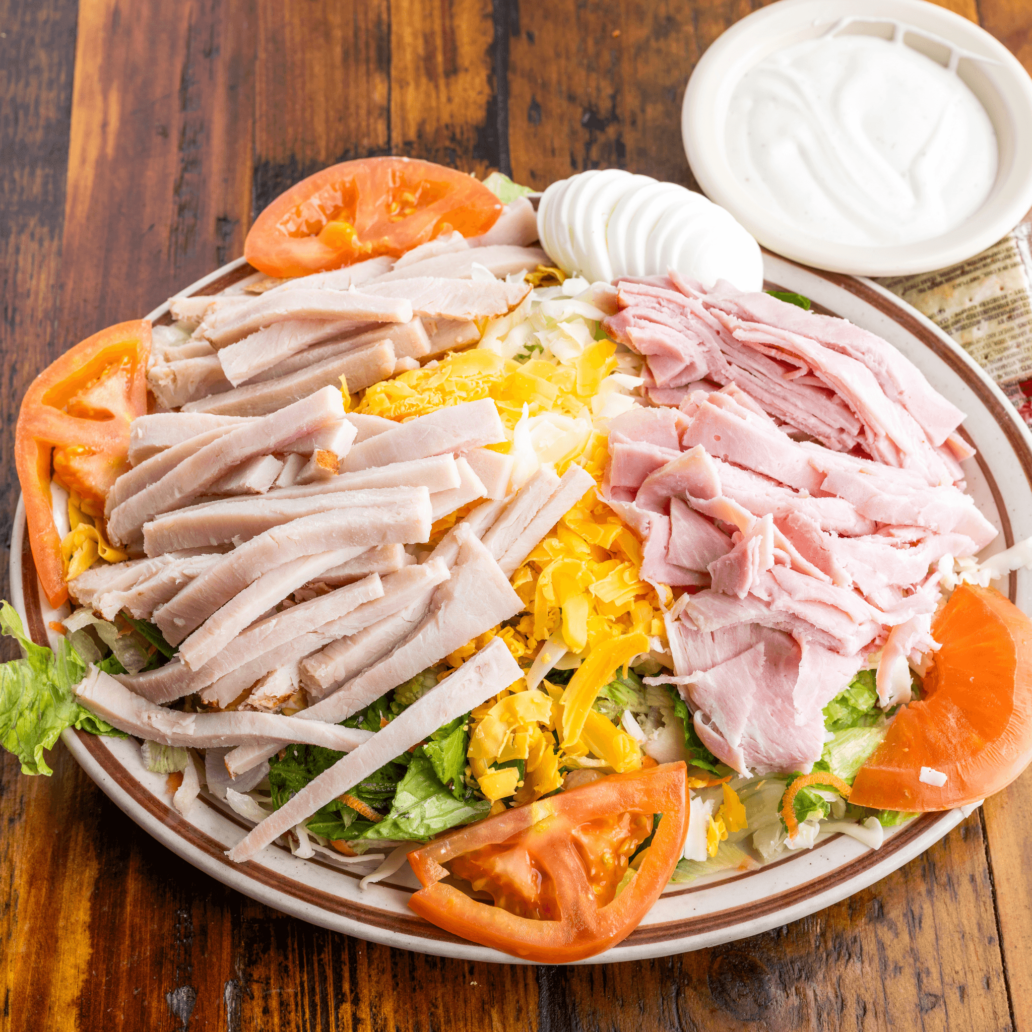 Sliced oven-roasted turkey, diced bacon, tomatoes, sliced hard-boiled egg, and blue cheese crumbles served on a bed of leafy greens