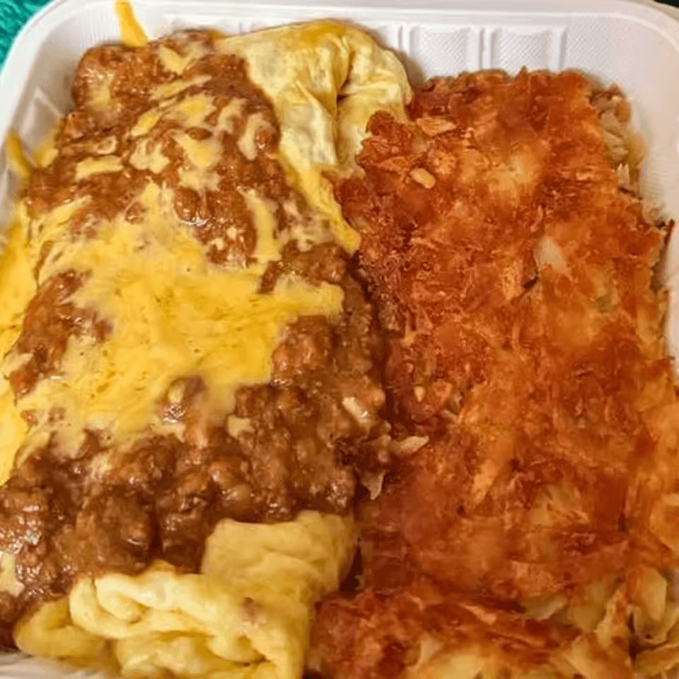 Served open-topped with home style chili and your choice of cheese and onions. Served with hash browns or french fries (after 10 am)