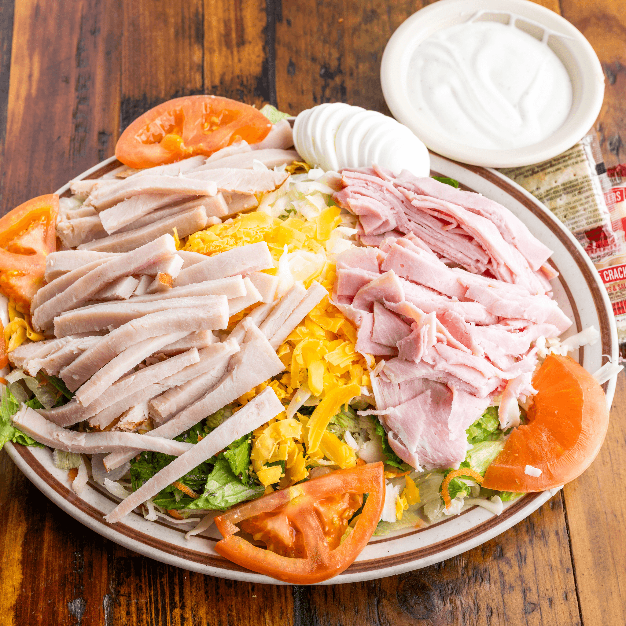 Sliced ham, oven-roasted turkey, tomatoes, sliced hard-boiled egg, and sliced American and Swiss cheese on top of a bed of leafy greens