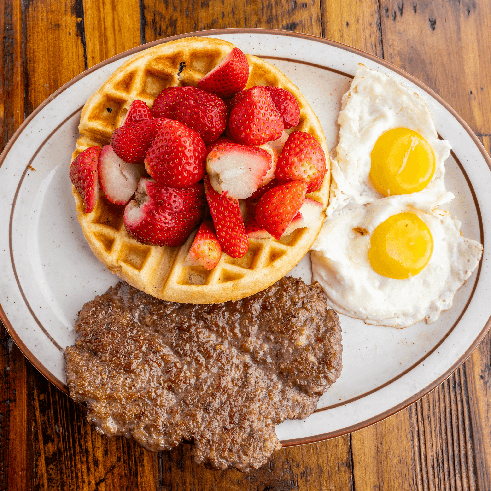 Gigantic home style country fried steak topped in our signature country gravy and served with 2 eggs any style